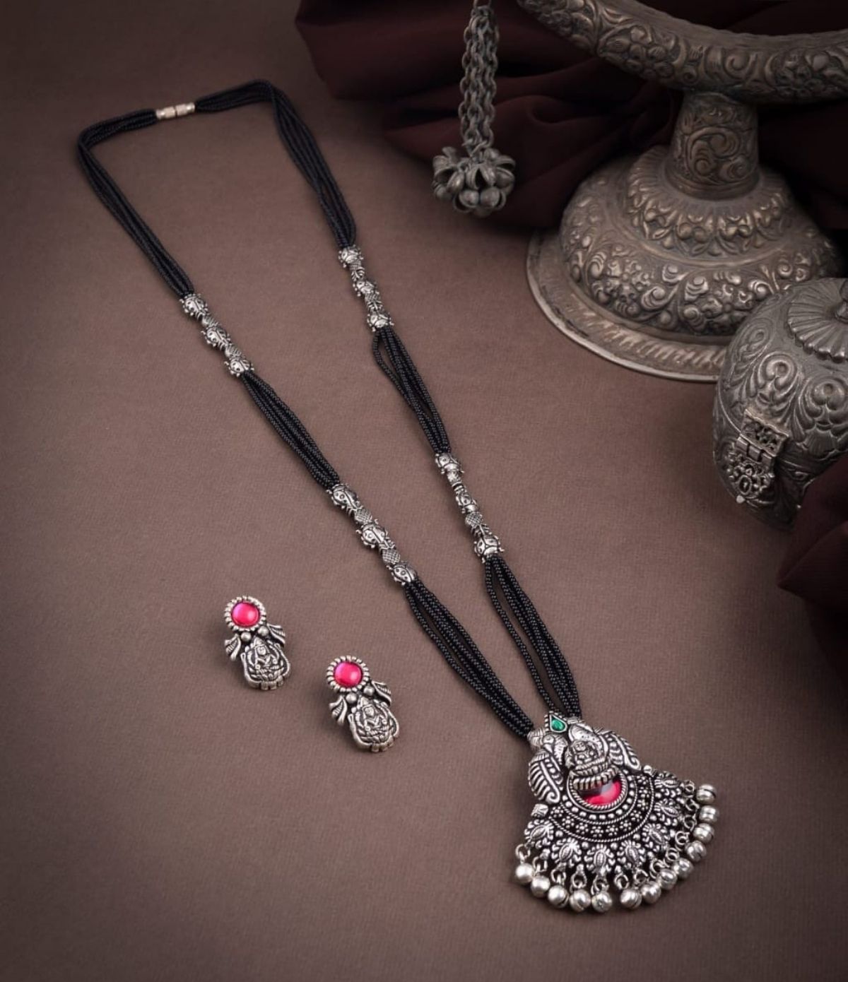 This German Silver long mangalsutra is for the modern woman who loves to blend tradition with contemporary trends. The antique silver finish gives it a bohemian chic vibe, perfect for pairing with cotton sarees, kurtis, and fusion wear.