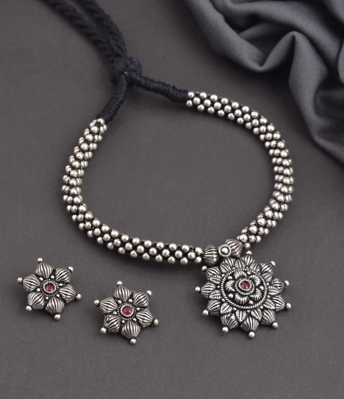 This Thushi choker combines the traditional woven-bead design with the modern appeal of German silver. The antique finish and detailed pendant make it a standout piece that’s perfect for Navratri and other festive events.