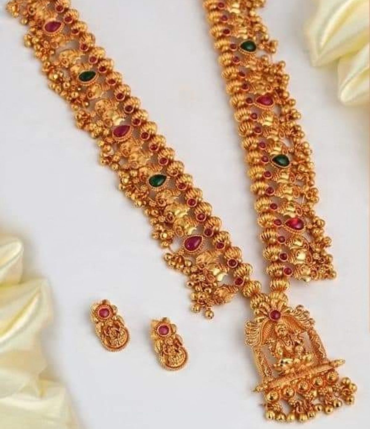 Adorn yourself with divine grace. This magnificent Kolhapuri Saaz features a beautifully detailed pendant of Goddess Laxmi, the symbol of wealth and prosperity. The intricate craftsmanship combined with the sacred motif makes this necklace an essential piece for religious ceremonies, weddings, and celebrations. Finished in a rich geru polish, it radiates antique opulence.