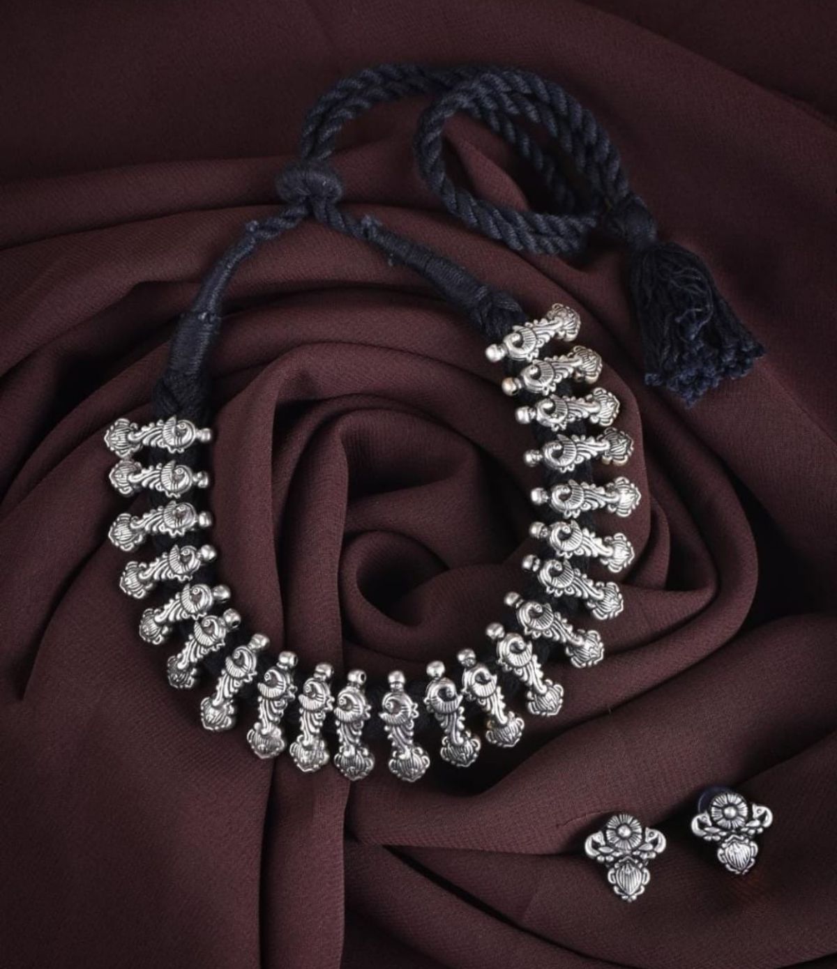 This necklace is a beautiful example of fusion design. The intricately crafted German silver pendant is suspended from colorful, sturdy threads, creating a look that is both ethnic and contemporary. Perfect for pairing with kurtis and fusion wear.