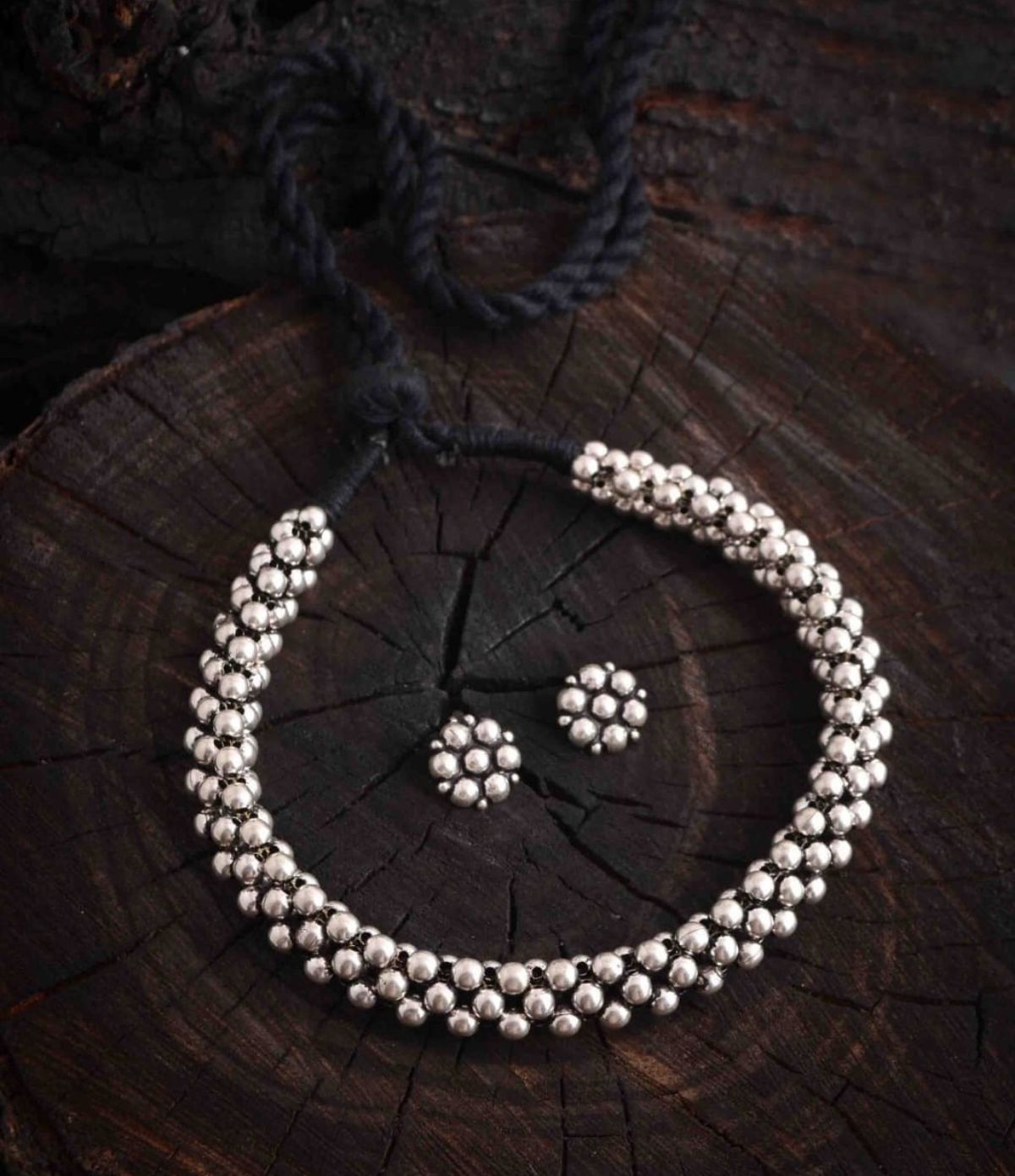 This piece is a must-have for lovers of oxidized jewellery. The traditional Thushi design is given a modern, edgy twist in this all-silver version. It sits beautifully on the neck and makes a powerful style statement.