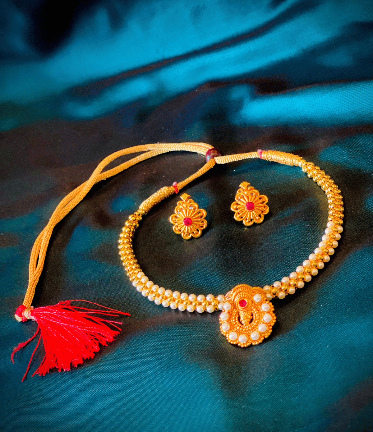 With a pendant design distinct from its counterparts, this delicate Thushi offers another beautiful option for your collection. It’s perfect for gifting or for adding a simple touch of Maharashtrian elegance to your look.
