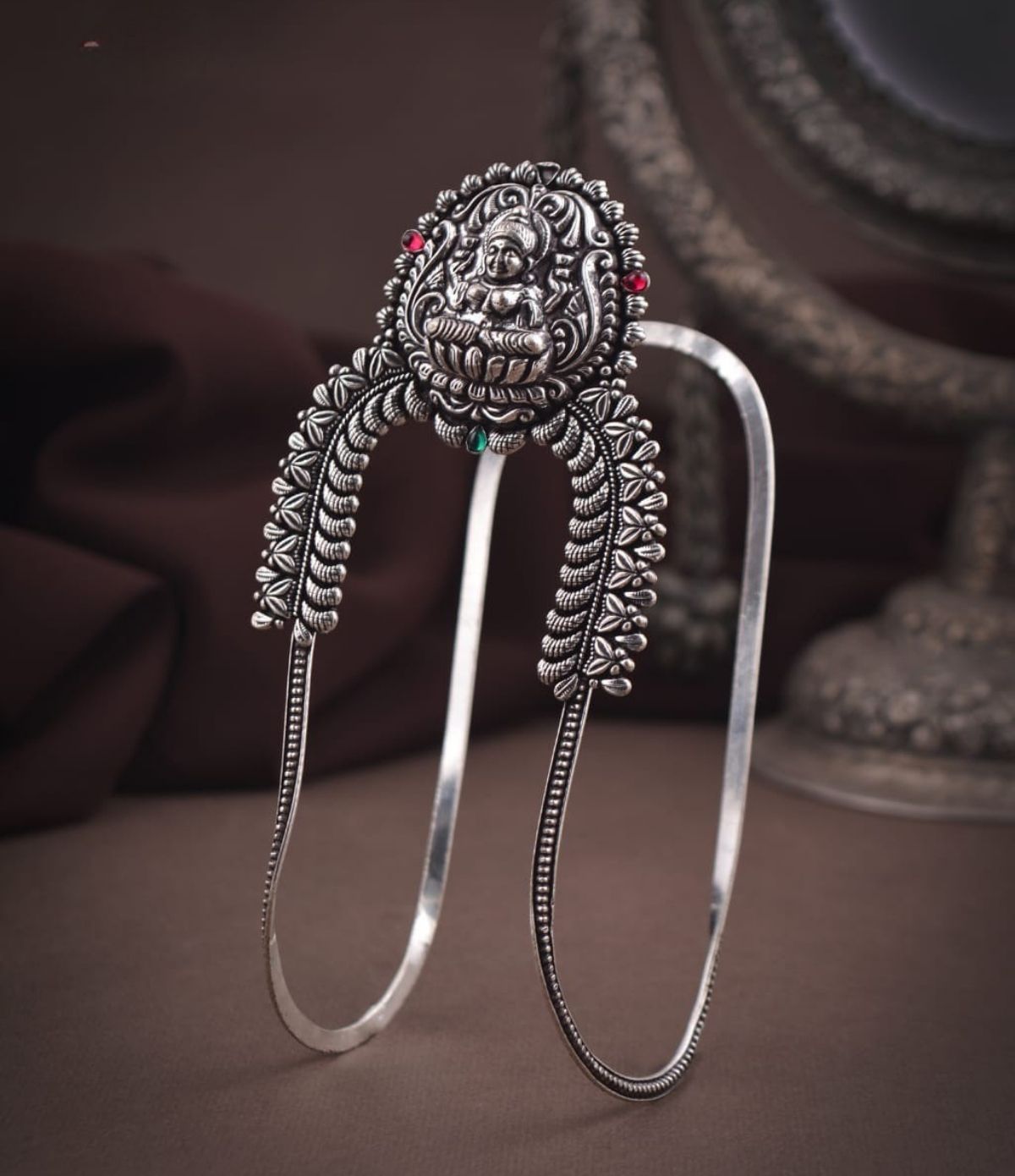 This German silver Bajuband showcases the revered Laxmi motif in a rustic antique finish. It’s a perfect accessory for creating a coordinated oxidized jewellery look for festive occasions.