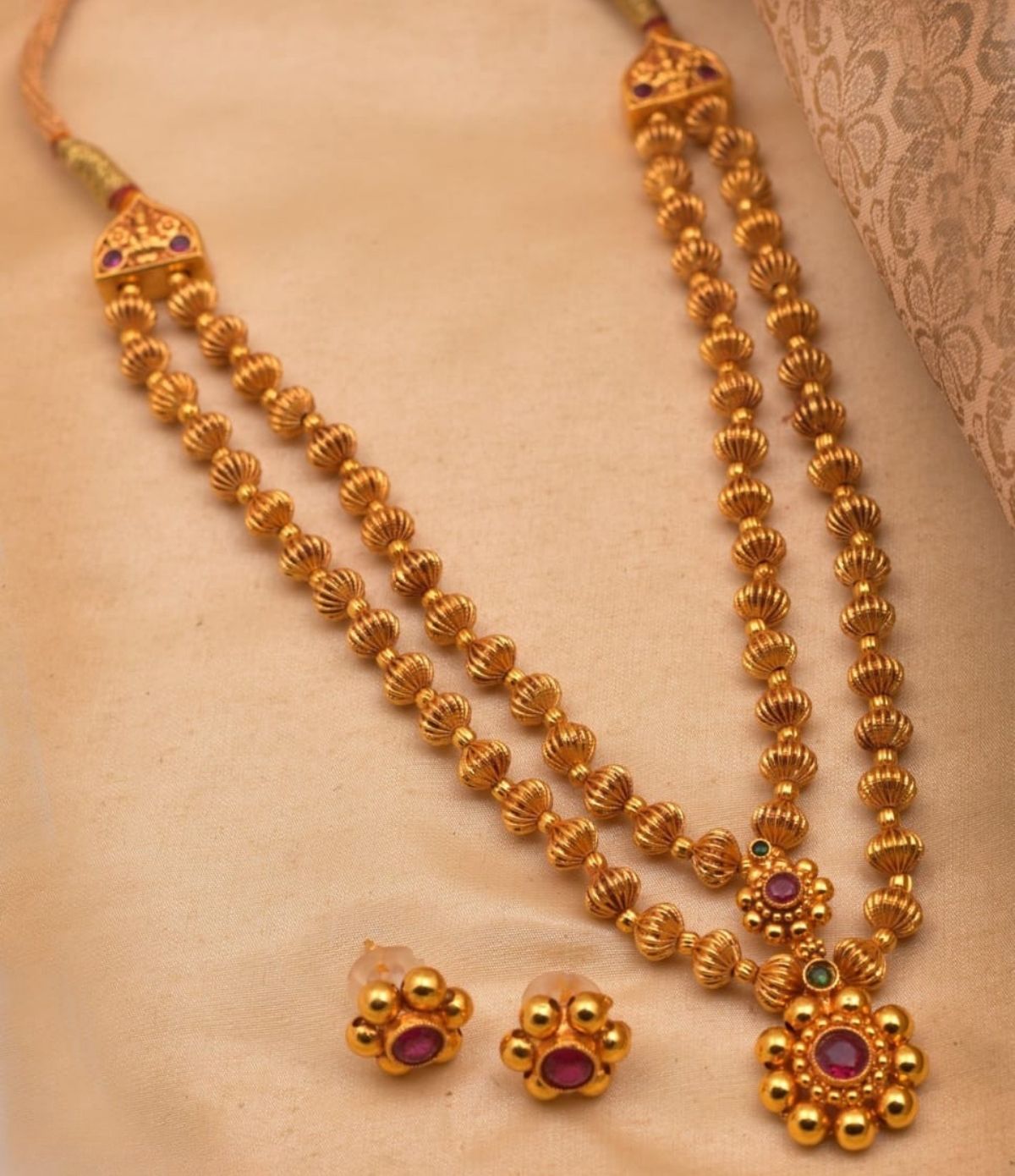 This charming 2-layer mala is made with Jav Mani, beads inspired by the shape of barley grains, which are a symbol of abundance. Its lightweight and graceful design make it perfect for daytime functions and religious ceremonies.
