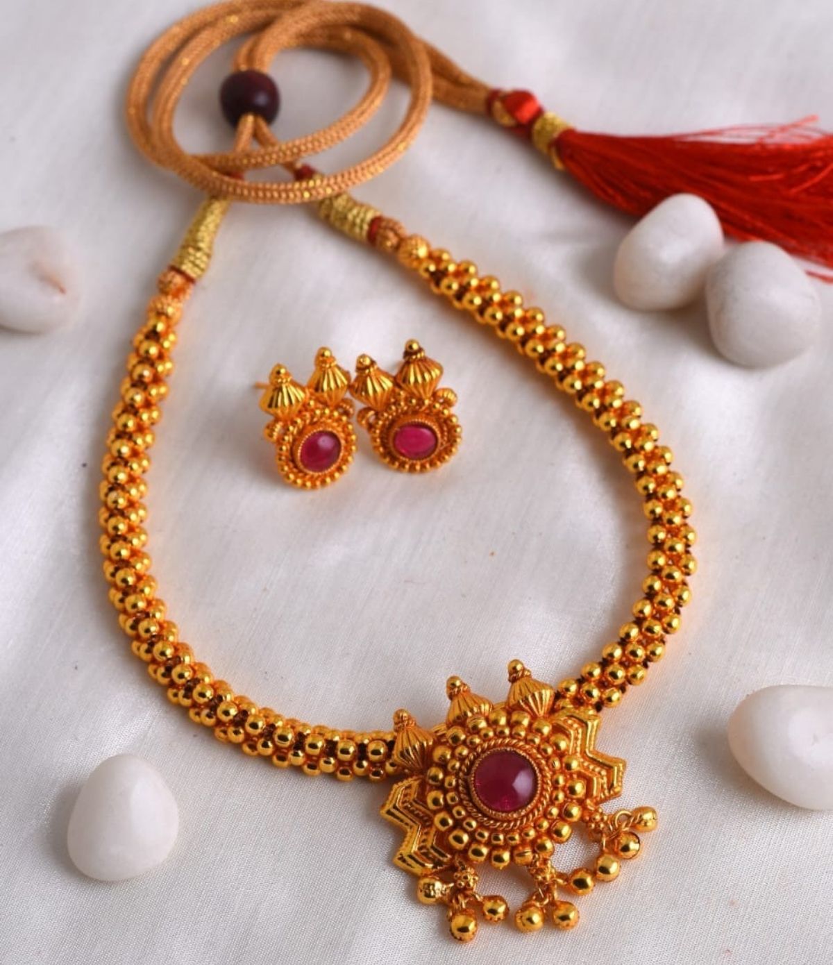 The Thushi is a quintessential Maharashtrian choker, beloved for its flexibility and intricate look. This design features a lovely pendant that adds a focal point of elegance. It is lightweight, comfortable, and comes with matching earrings.