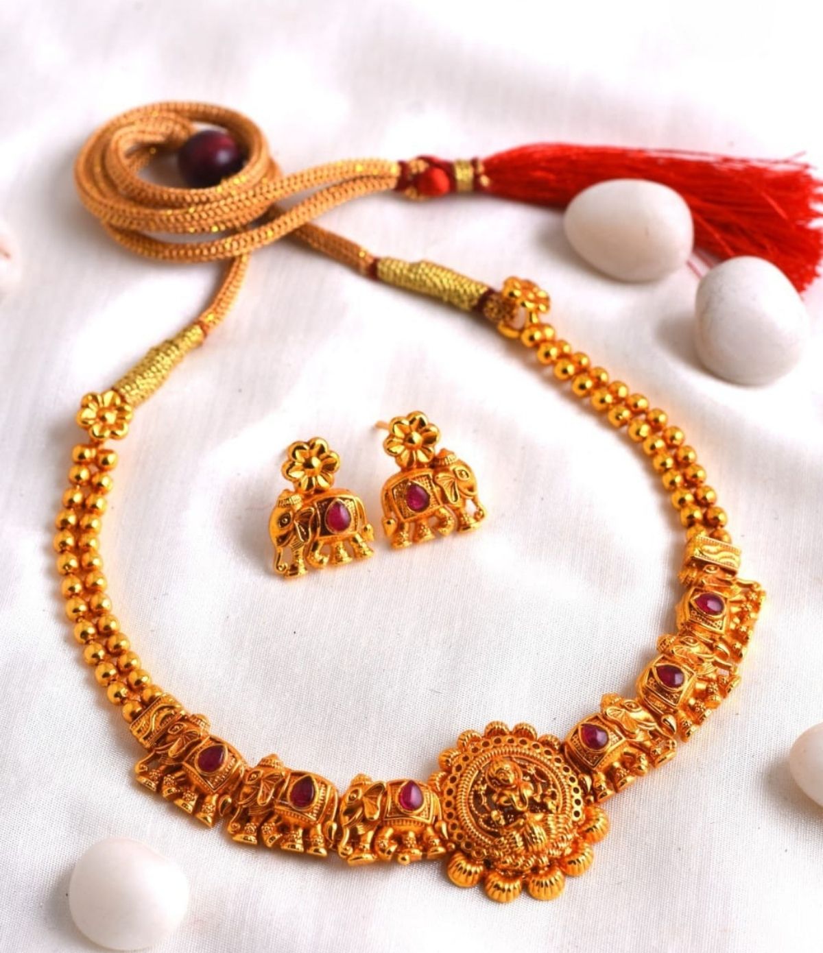 A beautifully crafted short necklace featuring the majestic elephant motif, a symbol of strength and good fortune. This 1-gram gold piece with geru polish is a unique and artistic accessory.