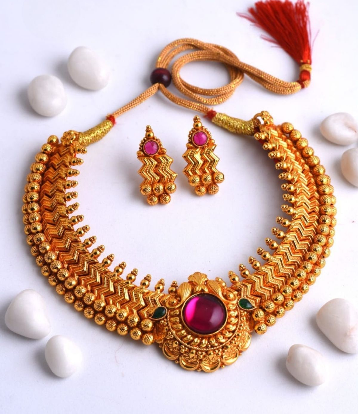 This exquisite Vajratik choker is made even more special with the addition of a radiant pink stone pendant. The pop of color adds a contemporary and feminine charm to the traditional, intricate golden design.