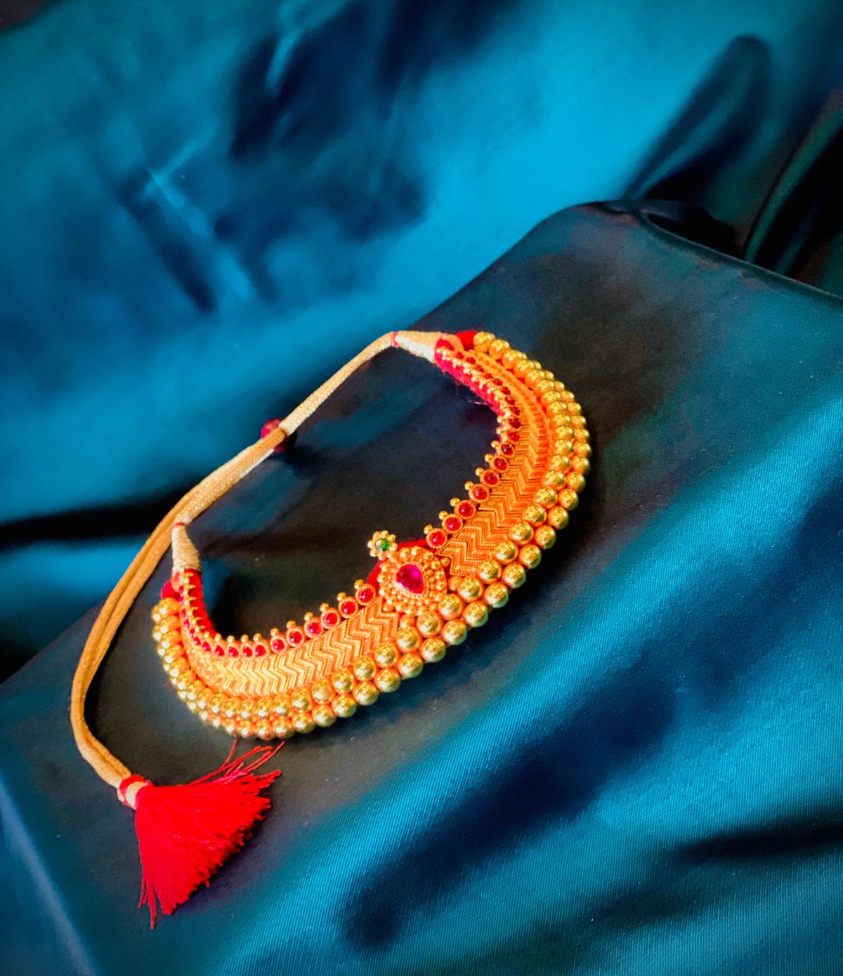 This Royal Vajratik offers a magnificent look with its detailed craftsmanship and traditional patterns. It is the perfect choice for those seeking a complete, coordinated bridal or festive set, as it includes beautifully matching earrings.