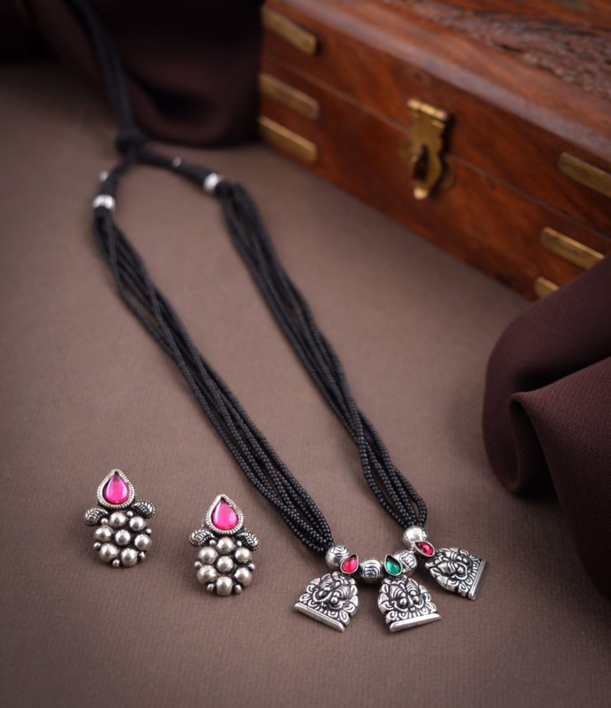 This beautifully designed mangalsutra offers yet another stylish option for the modern married woman. The combination of black beads and the antique-finish German silver pendant is both elegant and on-trend.